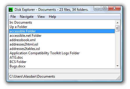 Windows Explorer (My Computer) is very accessible, but there are still complications: different views, several panes, lots of menu options. If you need a really easy-to-use way to move around the folders and directories on your machine, and open files and delete them, and go to different drives and CD drives and, then Disk Explorer is for you. It provides a list of the current folders and files as a simple sorted list, and always lets you go to your frequently-used folders with a couple of keypresses. And you can always switch to Windows Explorer at any time to use it if you want to do something more advanced.