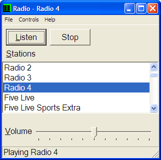 The BBC radio stations are all available online: this incredibly simple application lets you go through them and press return to listen to one! Here it is playing Radio 4.