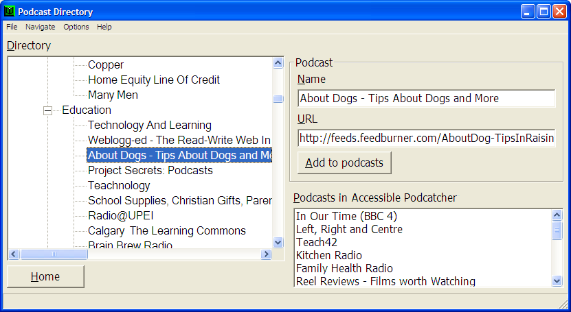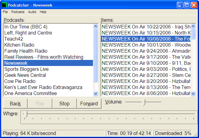 Podcasts are free audio programmes - like radio programmes - available on the Internet. Podcatcher gives you a simple and easy way to listen to podcasts from anywhere in the world, and Podcast Directory lets you find interesting podcasts to try out.