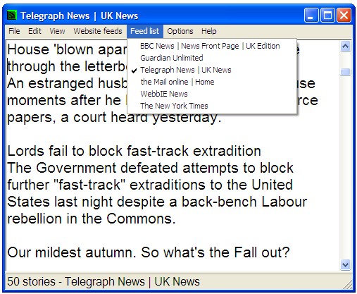 RSS News is a way to get the latest contents of web sites, like today's stories in a newspaper, in a simple and easy way. You can quickly go through the stories on lots of different sites and open interesting stories in WebbIE to read more. Here RSS News Reader is showing today's stories from the Daily Telegraph.