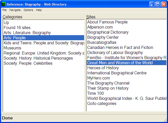 Finally, although WebbIE lets you search in Google directly, some people find it more profitable to use a directory of selected sites. Web Directory lets you explore the DMOZ Open Web Directory, find thousand upon thousands of interesting sites organised by category, then open the web pages in WebbIE for viewing.